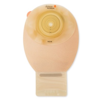 Offener Ileostomie-Ausstreifbeutel für die einteilige Stomaversorgung mit einem konvexen (nach "innen" gewölbten) Hautschutz.